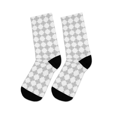 These socks are made using a proprietary blend of yarns specially sourced by Tribe Socks. They are 200 needle knit crew made from 58% Recycled Polyester 22% Nylon 15% Cotton and 5% Elastane. They are a true one size fits most, and are available up to size 12 Men's (U.S.). These socks have an unprecedented amount of stretch with durable print quality.